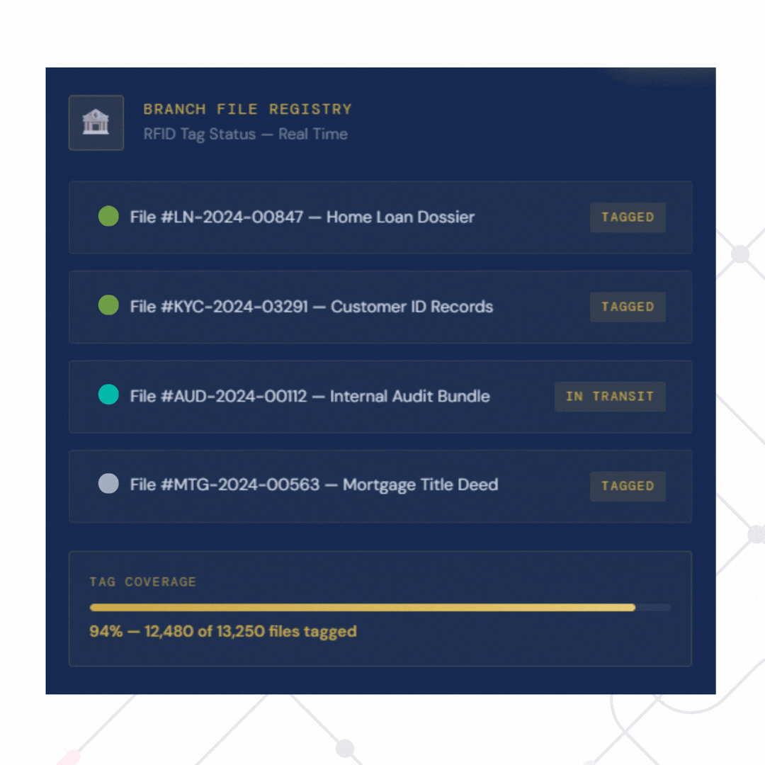 Banks generate thousands of physical records daily — loan applications, collateral documents, audit files. With RFID and barcode tagging, every file in your branch or archive becomes a tracked, intelligent asset.