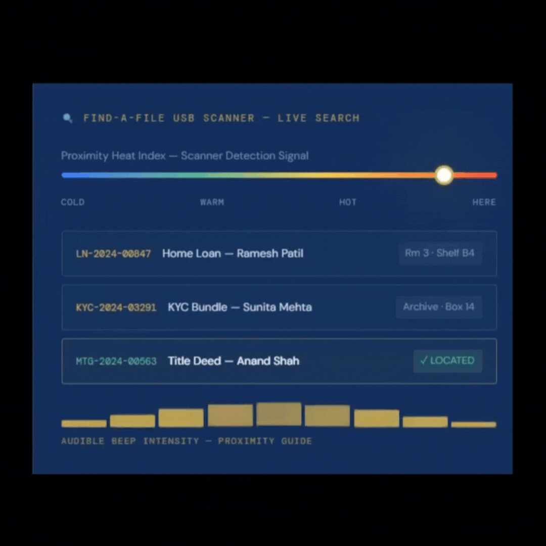 A missing loan file delays decisions and damages customer trust. The IoTFileTracker USB and handheld scanner transforms a hours-long search into a 30-second guided retrieval — even finding files tucked in closed drawers or stacked boxes without line of sight.
