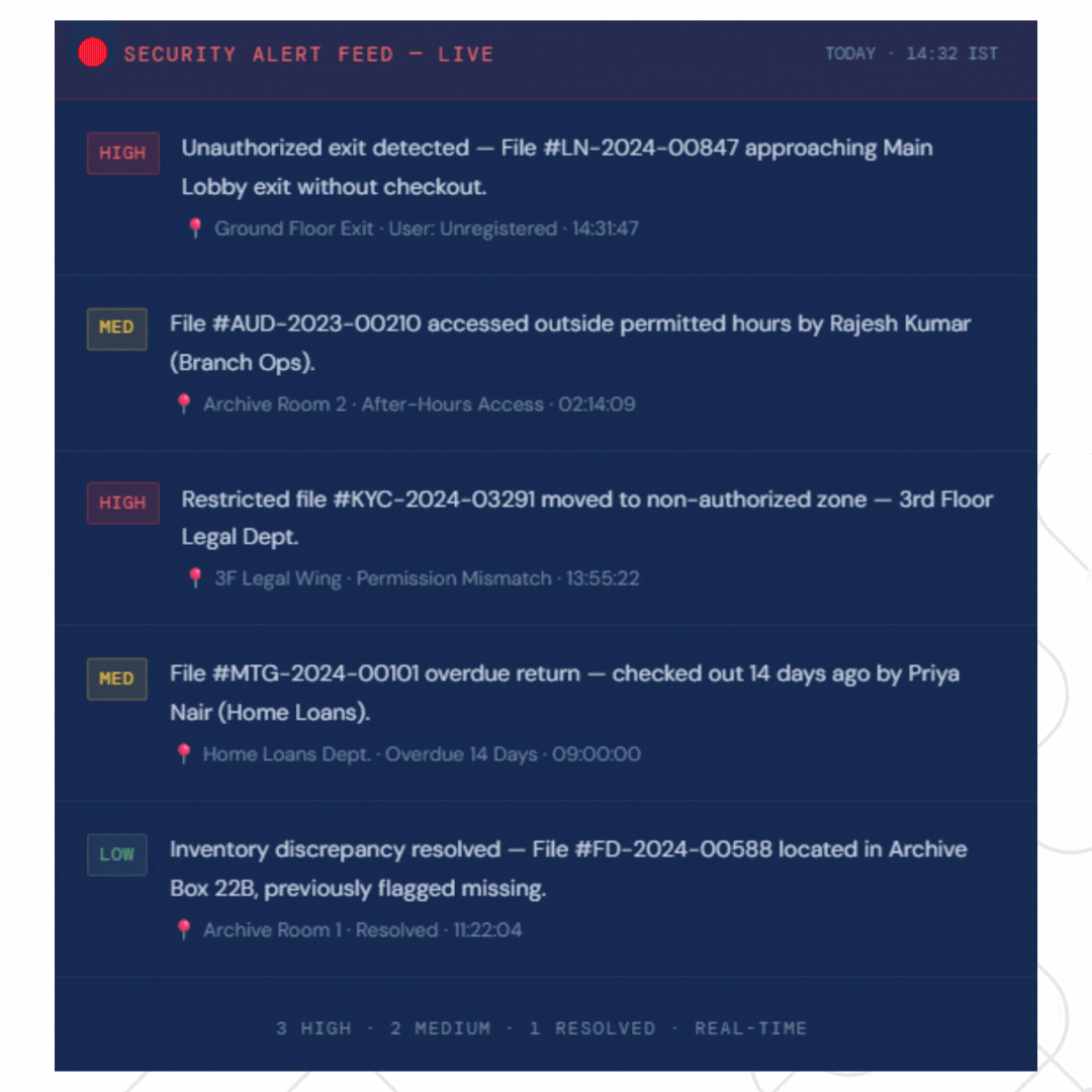 A single missing title deed or leaked KYC file can expose your bank to regulatory penalties and legal liability. IoTFileTracker’s RFID exit portals and instant alert system ensure no sensitive document leaves without authorization — automatically.